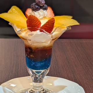 碧から紫へと重なる、印象的な色合いのパフェ。福島産ブルーベリーのジュレ、ぶどうのシャーベット、瑞々しい天津桃を重ね、色と味わいが響き合うプリンパフェに仕立てました。いちごと黄桃のコンポートを添え、福島自慢のフルーツと果汁の魅力を一杯に。グラスの中に広がる、絵画のような彩りをぜひご賞味ください。