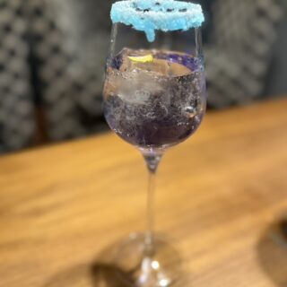 ゴッホの名画をグラスに。パルフェタムールの紫とレモネードで、星降る夜空を表現しました。縁を彩る星屑シュガーがきらめくお洒落な一杯です。