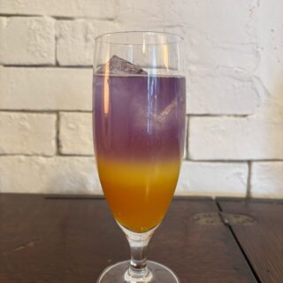 ゴッホの『夜のカフェテラス』をイメージした、バタフライピーティーのドリンク。パッションフルーツのピューレとオレンジジュースが織りなすグラデーションが美しく、夜景を思わせる色彩を楽しめるアートドリンクです。