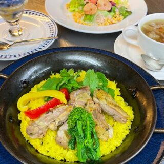 ozendate MASUZO ゴッホの鮮やかな色彩と、福島県産の食材を取り入れた特別メニューです。サフランが輝く黄金色のパエリアは、伊達鶏と県産野菜を合わせ、『ひまわり』を思わせる華やかな一皿に仕上げました。バタフライピーティーの深い青で仕立てたミニパフェは、『夜のカフェテラス』をイメージ。青の色合いで、作品の雰囲気をやさしく表現しています。