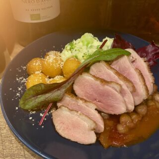 角打ちビストロ 蔵ひろ オランダの伝統的な家庭料理「スタンポット」。じゃがいもと緑色の野菜を丁寧に潰し合わせた、マッシュポテトのような一皿です。本来はソーセージを添えるのが一般的ですが、今回は香ばしく焼き上げた鴨のローストを合わせました。鴨料理はフランスでも古くから親しまれてきた定番料理。ゴッホの足跡にちなみ、故郷オランダとゆかりの地フランス、それぞれの食文化を掛け合わせた特別な一皿としてご提供いたします。