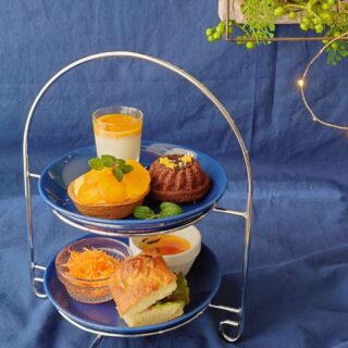 cafe120 『夜のカフェテラス』をイメージした色合いでまとめたアフタヌーンティセットです。クグロフの“黄色い星”、柑橘のタルト、人参ラぺやクレームブリュレ、ひまわりの種付きフォカッチャなど、甘いものと軽食を少しずつ楽しめる内容にしています。絵を眺めるように一つひとつの色や味を感じながら、一人でもゆっくり過ごしていただけるセットです。