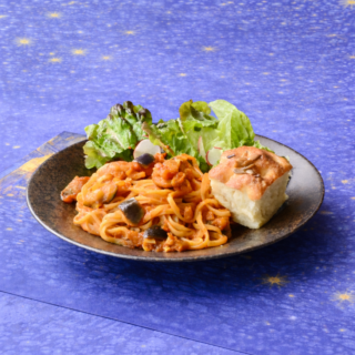 - 夜のカフェのカポナータ 生麺パスタ ーひまわりの種のフォカッチャ添えー
